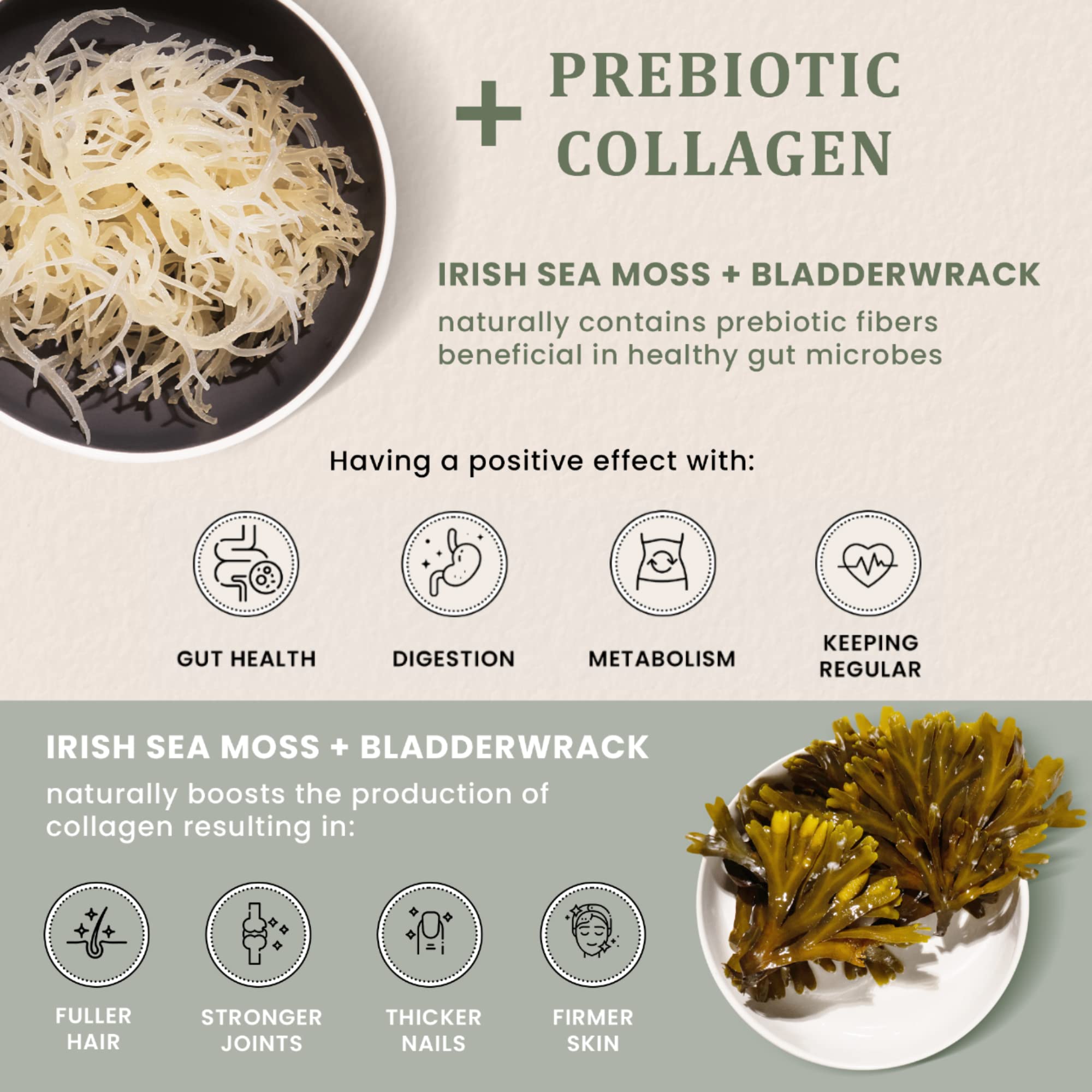 • PREBIOTIC + COLLAGEN: Sea moss naturally contains prebiotics which has a positive effect on gut health, digestion and metabolism. Seamoss also naturally boosts the production of collagen in your body resulting in fuller hair, stronger joints, thicker nails and firmer skin.