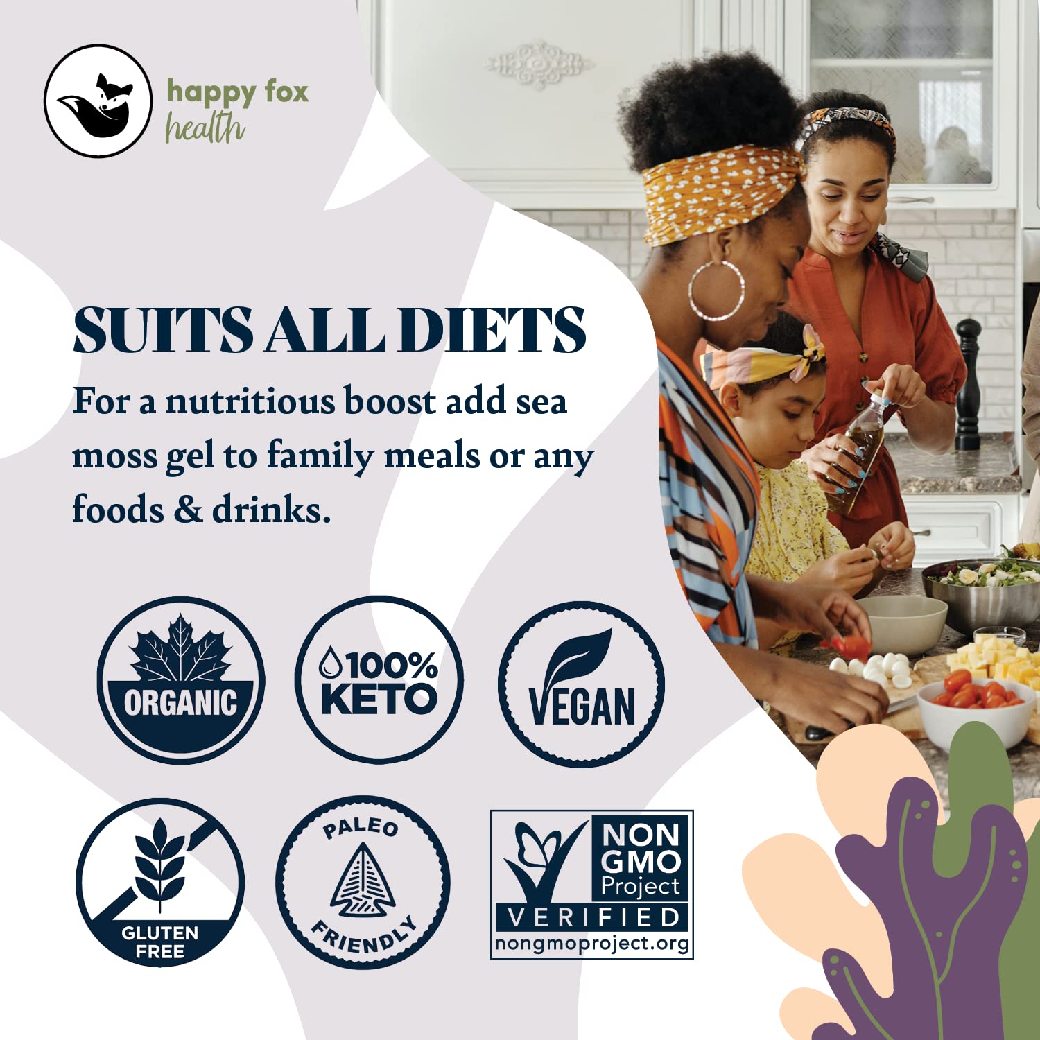• SUITS ALL DIETS & EASY TO USE: Happy Fox sea moss is perfect for anyone on any diet. It’s versatile, organic, vegan, paleo, keto-friendly and non-gmo verified. Our seamoss is all natural, rich in nutrients and neutral in taste. Simply add sea moss gel to any family meal. Stir, shake or blend into your favorite sweet or savory foods & drinks for a nutritious boost.